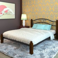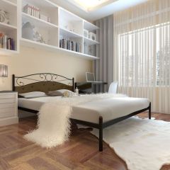 Металлическая настенная полка станет прекрасным дополнением к кровати. Фигурные завитки на кронштейне полки повторяют узор спинок кровати, делая интерьер спальни завершенным.